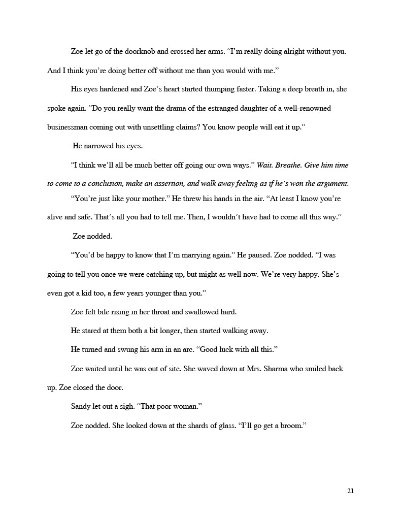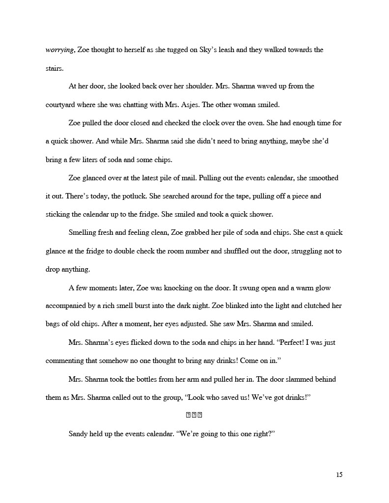 As part of the writing process, we workshopped each story in class. The suggestions that I received from my classmates included: