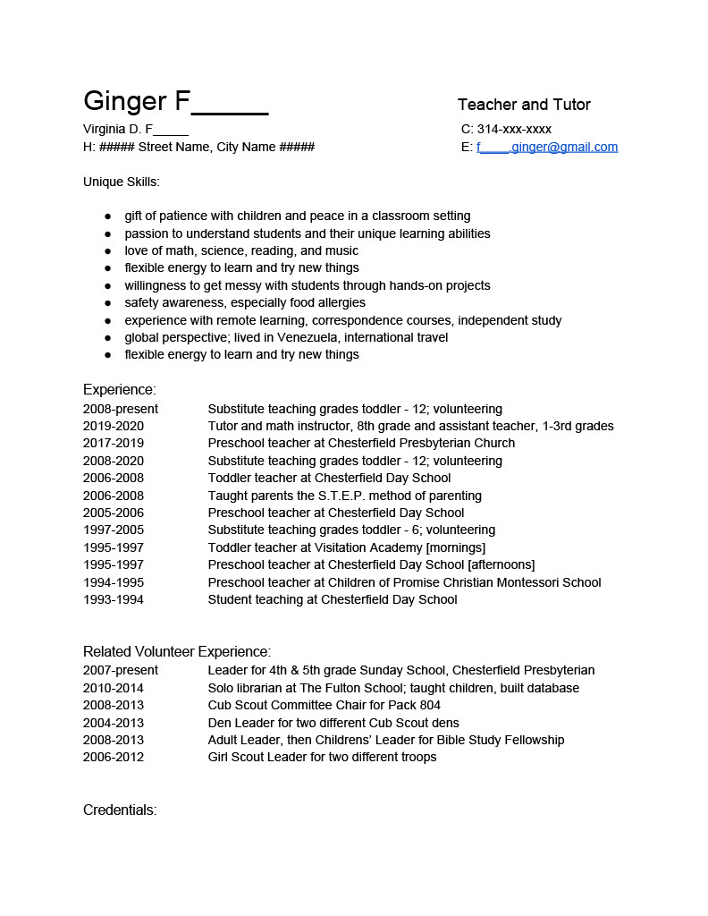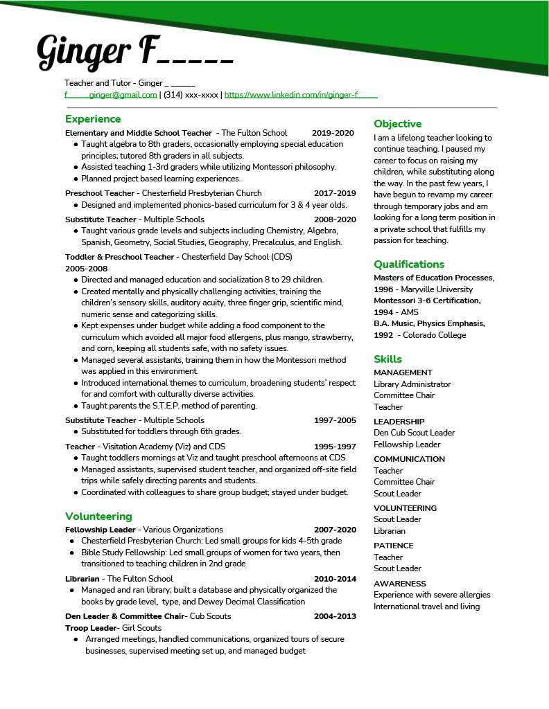 Ginger was a long-time teacher that was looking to get back into the full-time game. She had a huge amount of experience, knowledge, and qualifications, as you can see listed in her old resume. However, after listing those all, there wasn’t enough space for her to explain specific responsibilities and skills that went along with each experience.