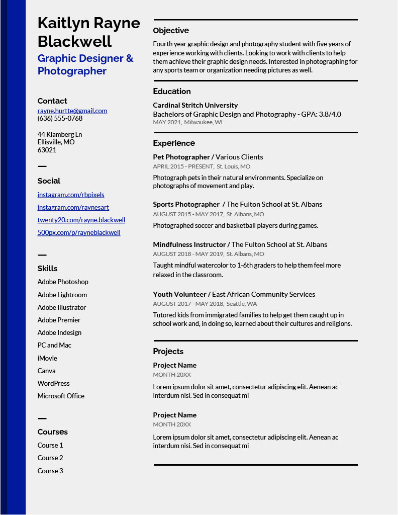 The second resume focused on her wealth of experience and knowledge in graphic design and photography. Furthermore, it highlighted social media where recruiters could easily see her work and witness her skill. (It is still a work in progress, as you can see by the sections at the bottom!)