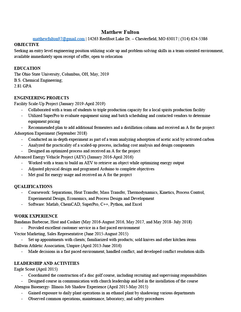 Matthew had just graduated college and was on the hunt for jobs. He was looking for engineering positions, so his layout of his old resume, though a little boring, was not uncommon. However, after looking through examples of engineering resumes, I decided that it would not be uncommon or bad to use a different resume layout. This decision was especially influenced by the fact that Matthew was considering applying to positions outside of engineering as well.