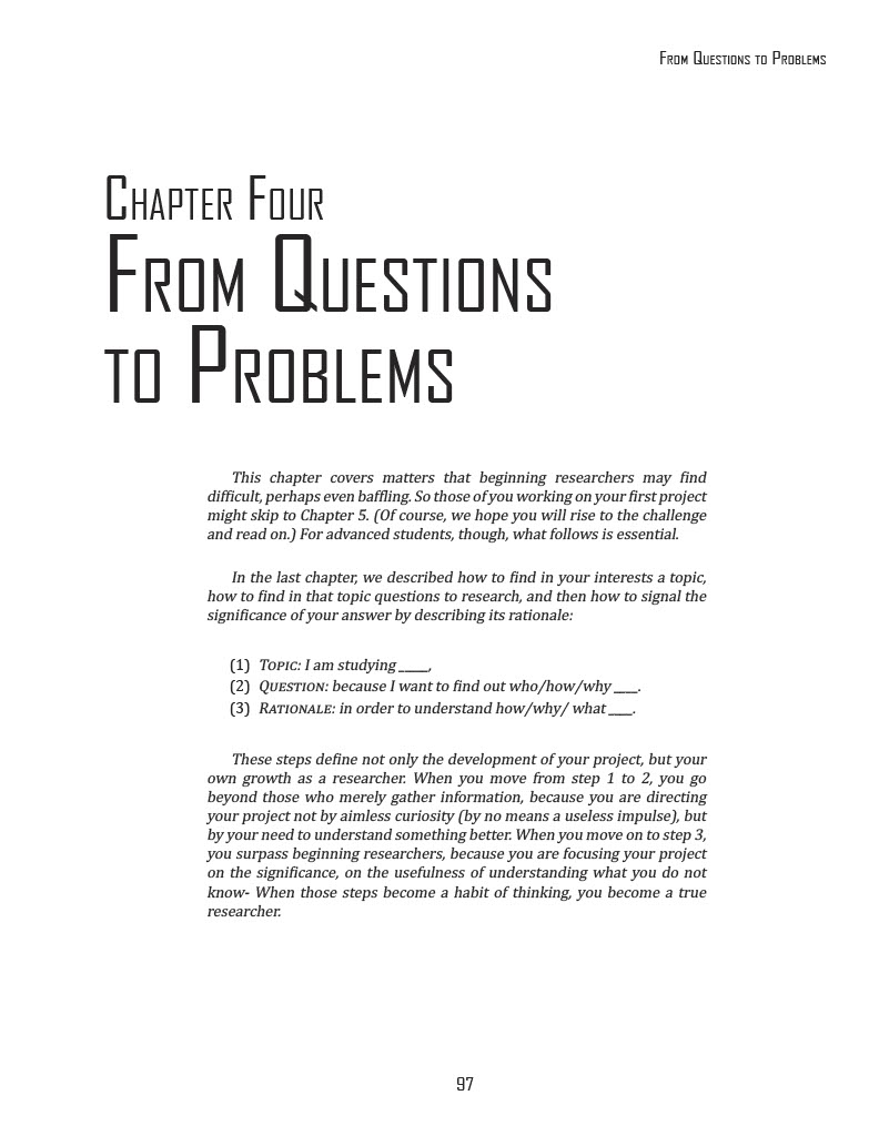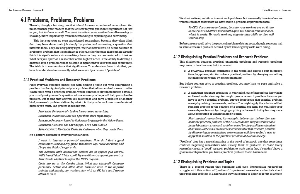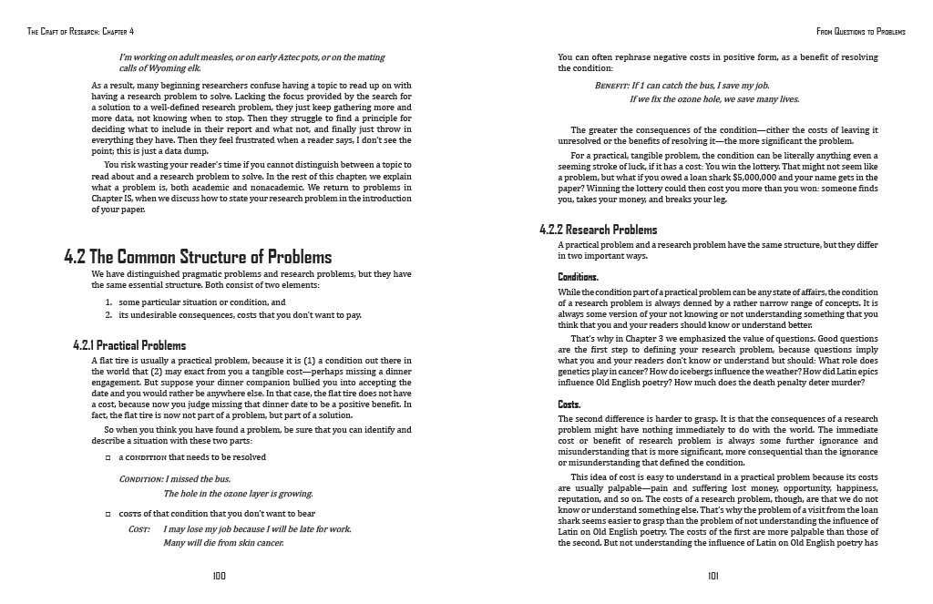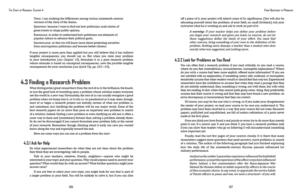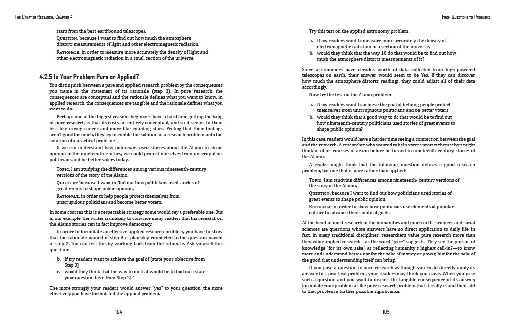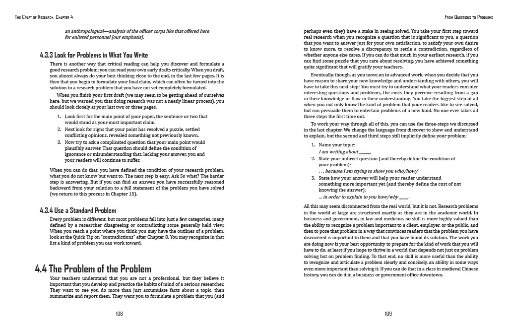 The dimensions were 51 by 66 picas, about 8.5 by 11 inches. This is the standard page size, as many textbook pages might be, and was the size we had to use for this assignment. The chapter comes from the textbook The Craft of Research.
